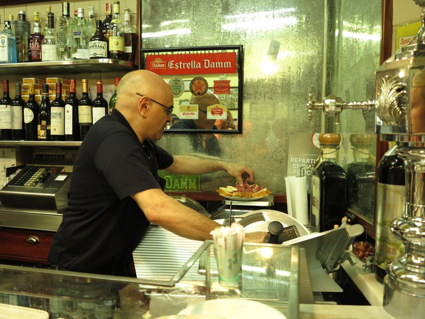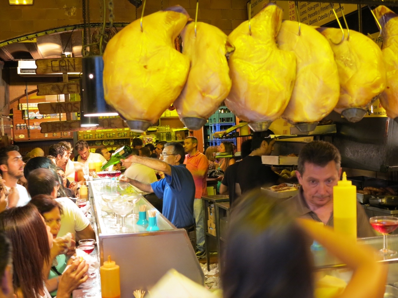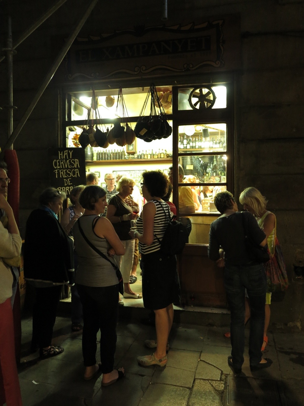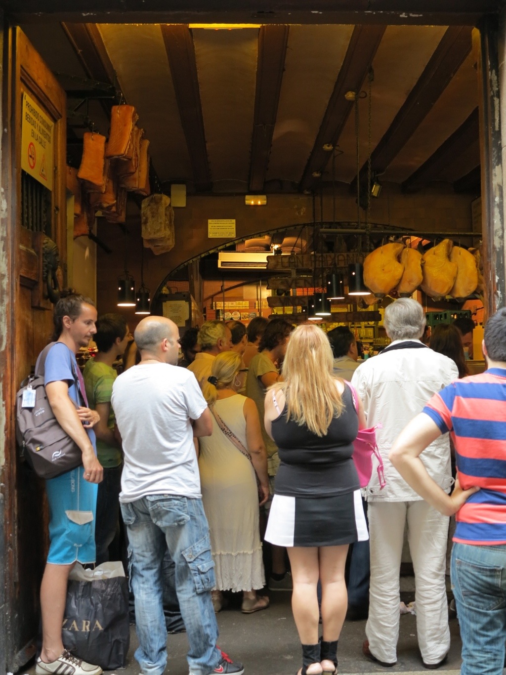 The first stop was a street cafe, bar, market, cave type place, hidden in a back street near the port. The only real sign of life was the huddle of satisfied looking people lingering on the crowded pavement outside. Having approached the entrance we were greeted with a wonderful cavernous view of a timeless bar with curing meats hanging from the ceiling. People were crowded near the bar shouting their orders and everyone, literally everyone, had a glass of 0.80EUR Cava in their hand accompanied by a plate of freshly made tapas – meat was clearly the speciality in this place. It was beauty and chaos combined.