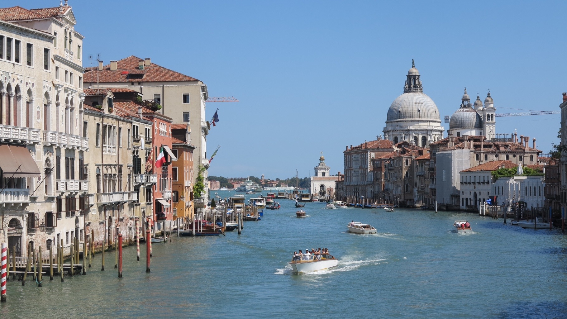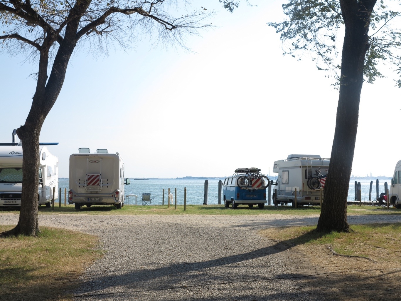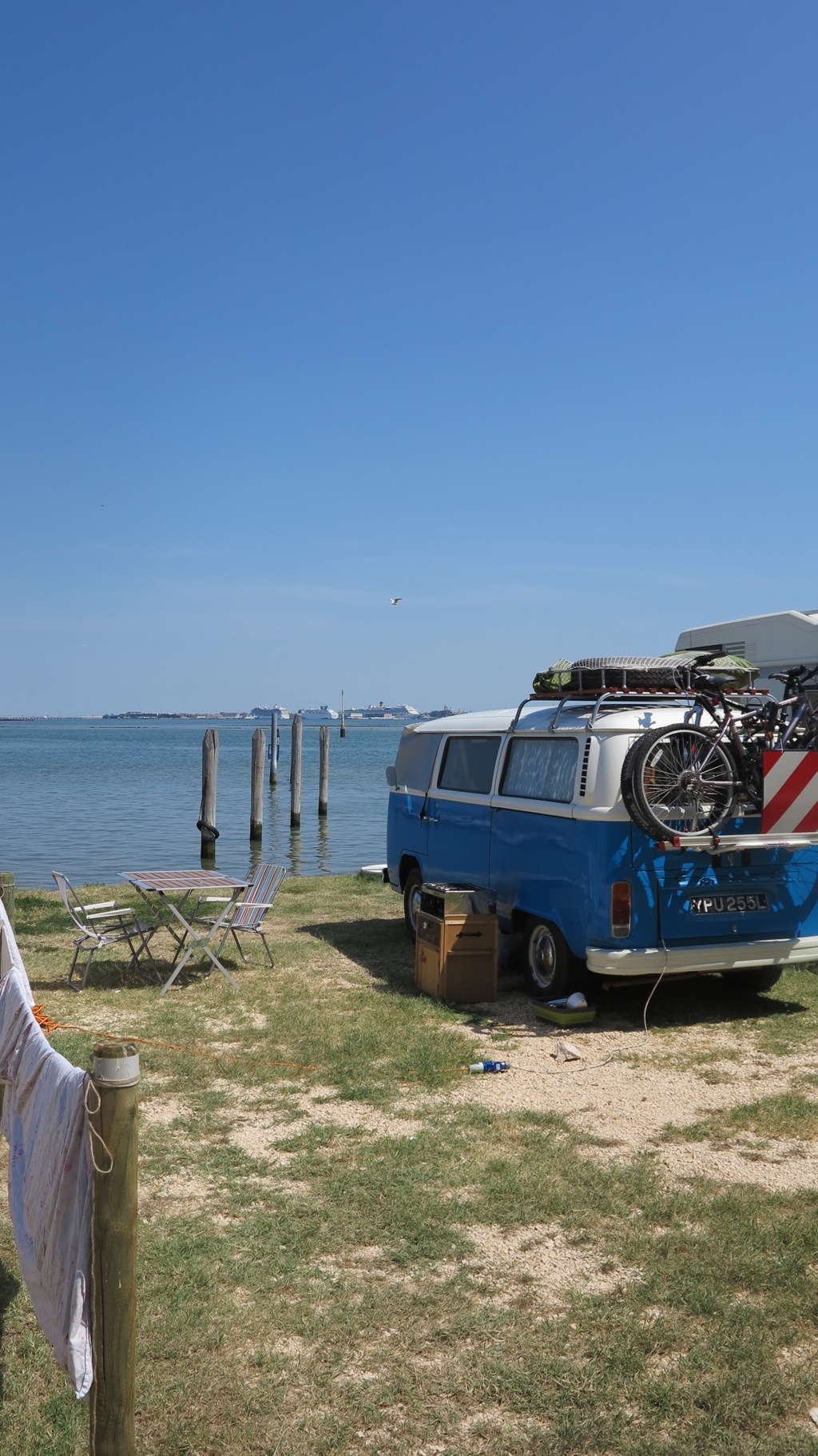 There are dozens of campsites to chose from most of which are set on the lagoon of the mainland surrounded by beaches. We decided to opt away from these as our trip wasn’t about beaches and so went for Camping Fusina which was 100 metres from a boat straight to Venice. We somehow found ourselves with a pitch right on the water’s edge looking over Venice in the afternoon sun. It was beautiful. We relaxed on the waters edge for the evening enjoying the peace and quiet…..until we went to the campsite bar where around 100 18 year old Aussies, Brits and Americans on a ‘Contiki’ holiday were dressed up in Venician masks and tanked up on shots and beers. We endeavoured to watch the Olypmic closing ceremony – which made me emotional and proud. It was wonderful to watch but by the time we got to George Micheal’s returning moment he was completely drowned out by the nightclub sound of a 2000 decibels and fornicating youths (yes we felt old).