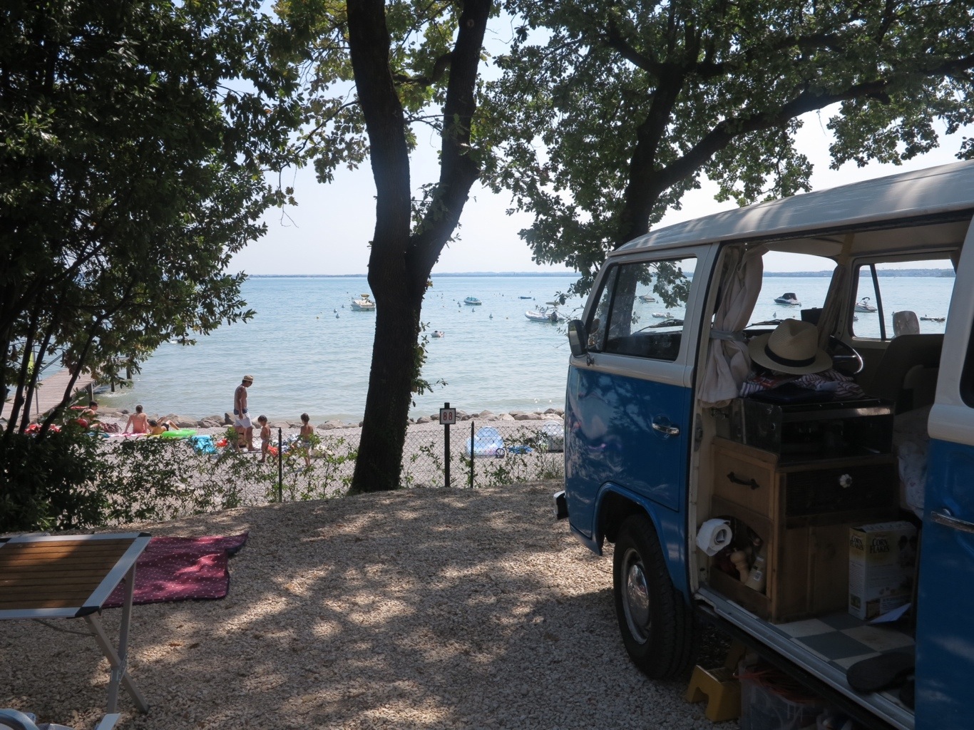 We left you in Verona….from there we made the short journey to Lake Garda. There are countless numbers of campsites all around the lakes and so we sort of closed our eyes and picked one at random from the book. As we made our way to our pitch we were attacked by what seemed like hundreds of over excited children pelting the camper with water bombs….We contemplated running a few down to get them away but refrained and directed forced smiles of ‘how charming your kinds are’ at the parents instead. Turns out it was an Italian public holiday which means everyone takes a day off work to drench their nearest and dearest during all day water fights. This becomes increasingly strange when it became aparent that there were actually no Italians on site – we had managed to find ourselves at a Dutch campsite, owned by a Dutch couple, frequented by Dutch campers and where even the staff where Dutch school leavers working during the summer. Obviously we have nothing against the Dutch but it was pretty strange when, before we realised, we were trying to speak Italian to everyone and getting nowhere! We were tired from our ‘hectic’ site seeing extravaganzas and so decided to spend two nights there to recover (tough life) and so found ourselves quickly trying to remember any Dutch….but essentially giving in and speaking English.