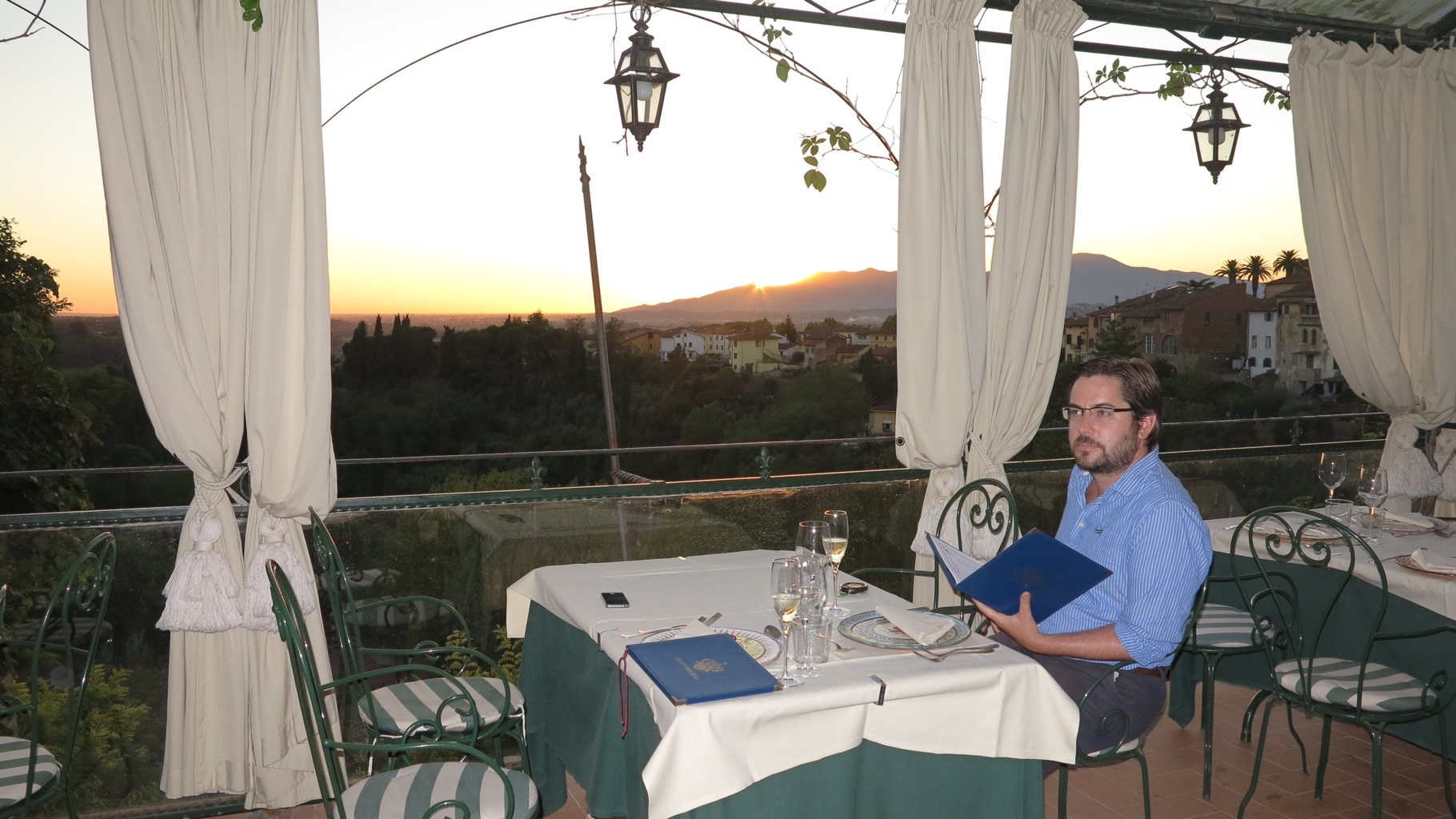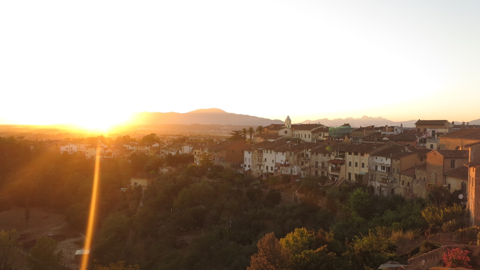 Delayed from 29th August…….In order to celebrate three months on the road we stayed in a little hotel in a town called Montopoli deep in the Tuscan hills between Florence and Pisa. We were greeted at the door by a lovely old Italian lady in what looked like her nightdress with her stockings crumpled up round her ankles! We had a great time trying to understand each other but having succeeded we were shown our little room which was very sweet with the bath about 70cms long and a great view of the elderly folks gathered in the town square nattering. The hotel was full of old antique items like pin ball machines, cameras, movie posters etc it was a treasure trove with cavernous alleys and little terraces everywhere. The view around the back was incredible and we discovered that they had a terrace restaurant which apparently I had already booked us in for with the lady on arrival (?!?). We sat down to a complimentary glass of prosecco and watched the sun go down on the Tuscan hills. We were also handed a bottle of insect repellant which we thought was very kind but perhaps over the top until moments later we were swatting and scratching and hastily reached for the spray.